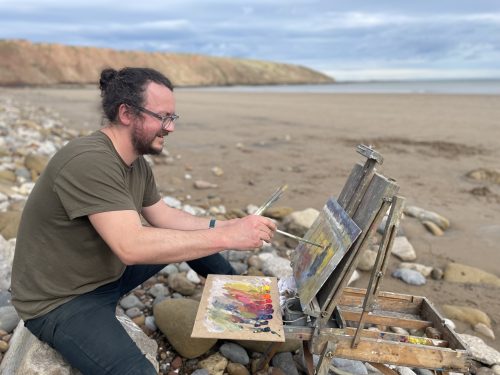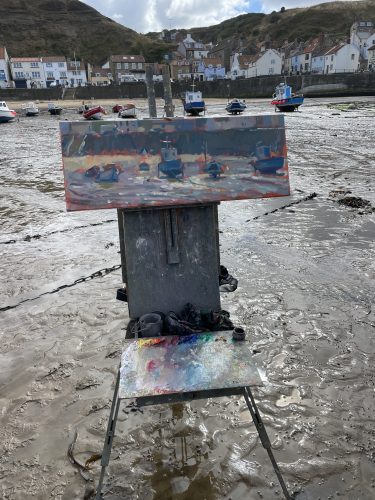 My painting journey started at North Landing, Flamborough, a hidden gem which boasts striking white cliffs and emerald-green water. As I moved North, often on the edge if the costal path on my bike, I stopped to take in different scenes; sailing boats out at sea, hidden coves and children playing on the beach. My aim is always to capture the characteristics of a place at a particular point in time.