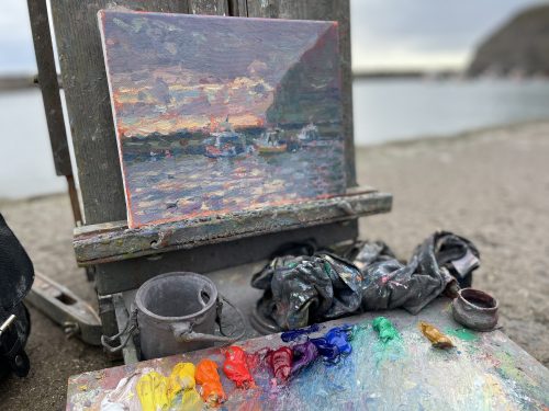 My final painting location was Staithes, the furthest north I ventured and one of my favorites. I love the view over the beck towards the sea from the high vantage point. It’s a great feeling to be continuing the tradition of plein air painting in this region.